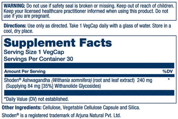 - Shoden® Ashwagandha (root and leaf extract): 240mg
